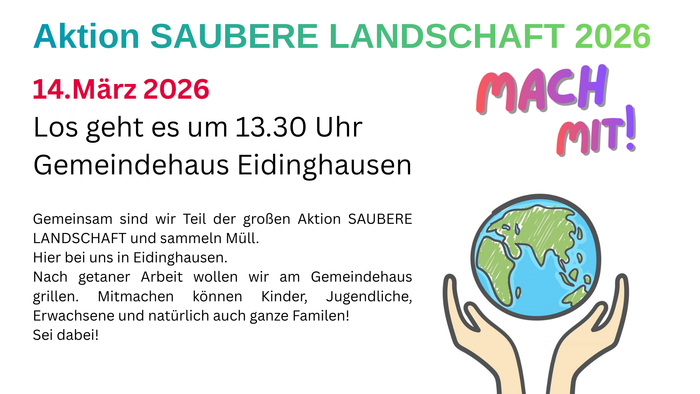 Am Samstag, den 14. März 2026 findet die diesjährige Ation SAUBERE LANDSCHAFT statt. In Eidinghausen ist der CVJM Eidinghausen-Dehme unterwegs und sammelt Müll und Unrat in der Natur und an Straßen und Wegen. Mach mit!