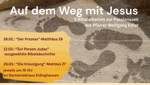 Dazu bietet Pfarrer Wolfgang Edler alle zwei Wochen in der Passionszeit jeweils donnerstags, 19.00h,im Gemeindehaus Eidinghausener Str. 133, Bibelarbeiten zu ausgesuchten Bibelabschnitten an, in erster Linie aus dem Matthäusevangelium.