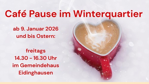 Seit vielen Jahren gibt es jeden Freitag das Café Pause in Dehme. Ein engagiertes Team aus ehrenamtlichen lädt jede Woche Menschen zu Begegnung und leckeren und Kuchen. In den Wintermonaten Januar - März 2026 zieht das Café Pause aus der Dehmer Auferstehungskirche ins Eidinghausener Gemeindehaus. Dort ist das Café Pause erstmals am Freitag, den 9. Januar 2026 von 14.30 - 16.30 Uhr geöffnet. Herzlich willkommen!