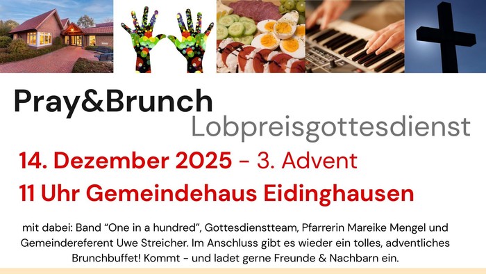 Am 3. Advent um 11 Uhr feiern wir den nächsten Pray&Brunch Lobpreisgottesdienst im Gemeindehaus Eidinghausen. Mit dabei ist wieder "unsere" Band ONE IN A HUNDRED. Gestaltet wird der Gottesdienst von einem Gottesdienstteam und Pfarrerin Mareike Mengel und Gemeindereferent Uwe Streicher.
