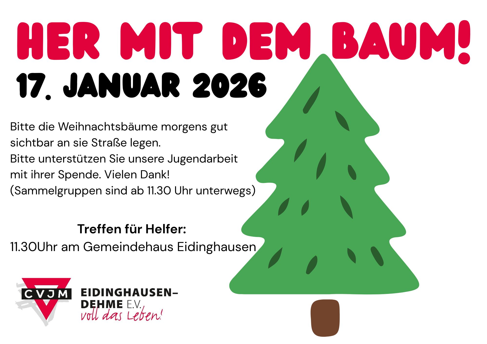 Am 17. Januar fand die diesjährige Tannenbaumaktion "Her mit dem Baum" des CVJM Eidinghausen-Dehme statt - eine Woche später als geplant. Am 10. Januar hatte die Witterung der Sammlung einen Strich durch die Rechnung gemacht.